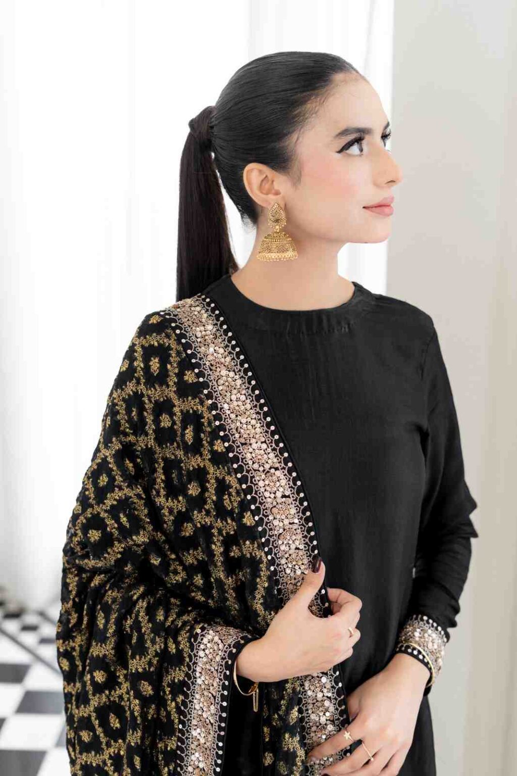 This elegant ensemble features a straight black shirt with a dull gold heavy border on the front and back. The outfit is complemented by a black shawl with matching heavy borders on all four sides. A pair of choori daar completes the look, offering a polished and sophisticated style, perfect for formal occasions.