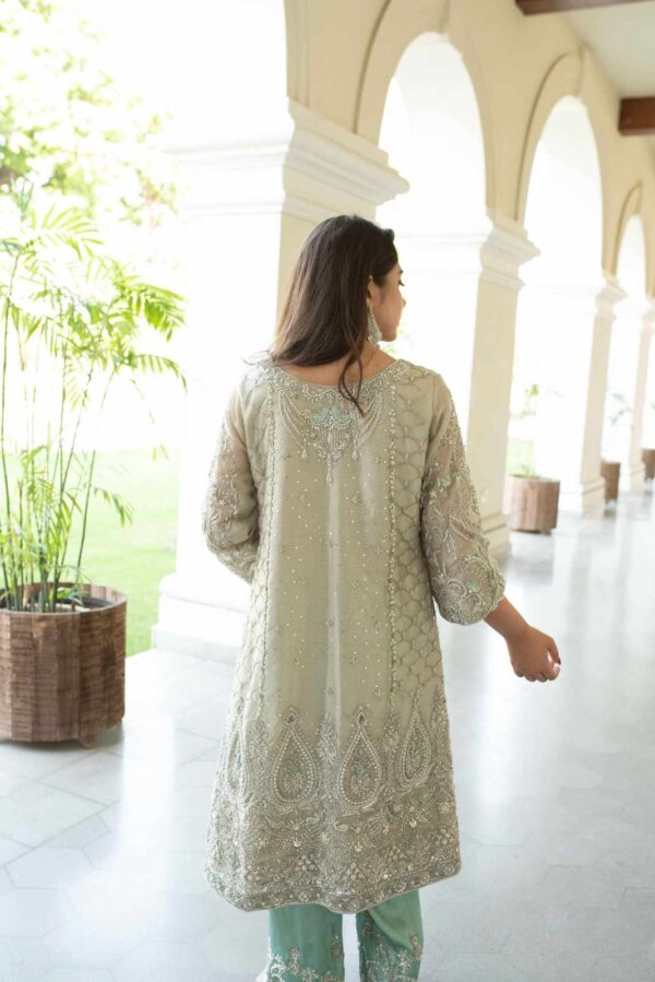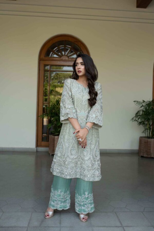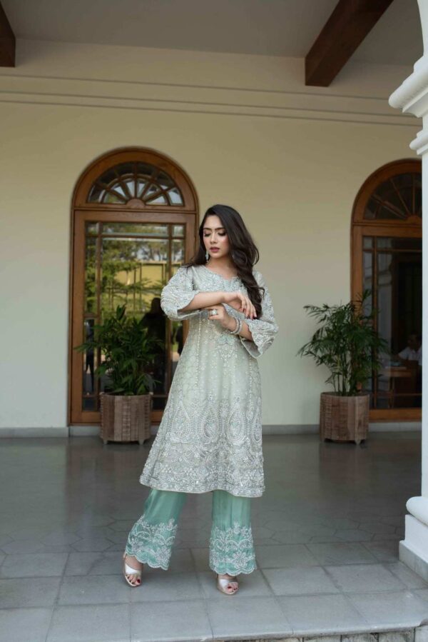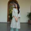Tissue embellished heavy A-line shirt with embellished bell sleeves – silver kora dabka,crystal and pearl work. With pure silk embellished pants in contrast. A very subtle combination!
