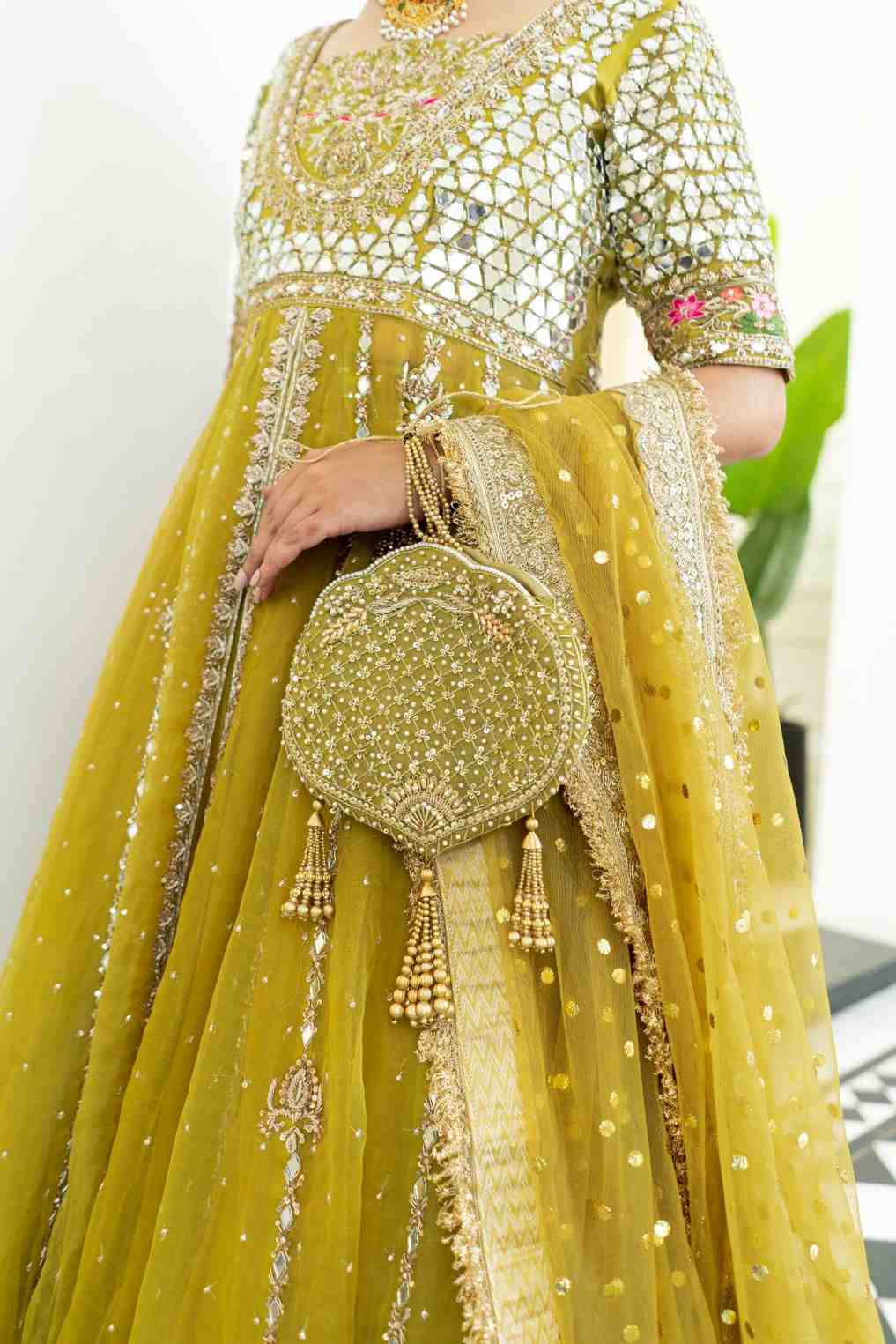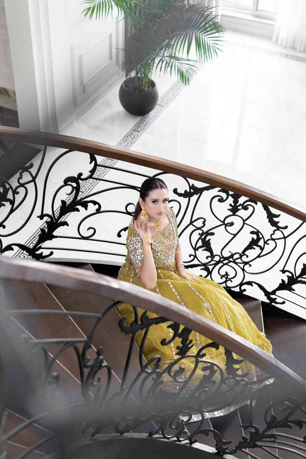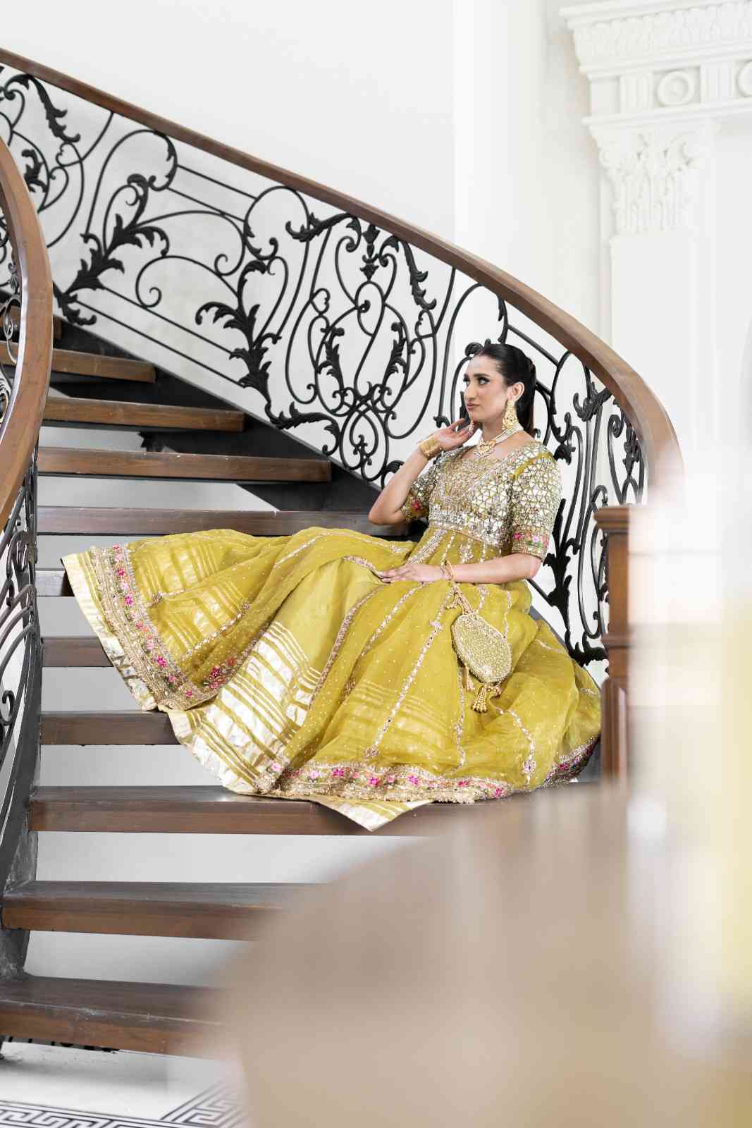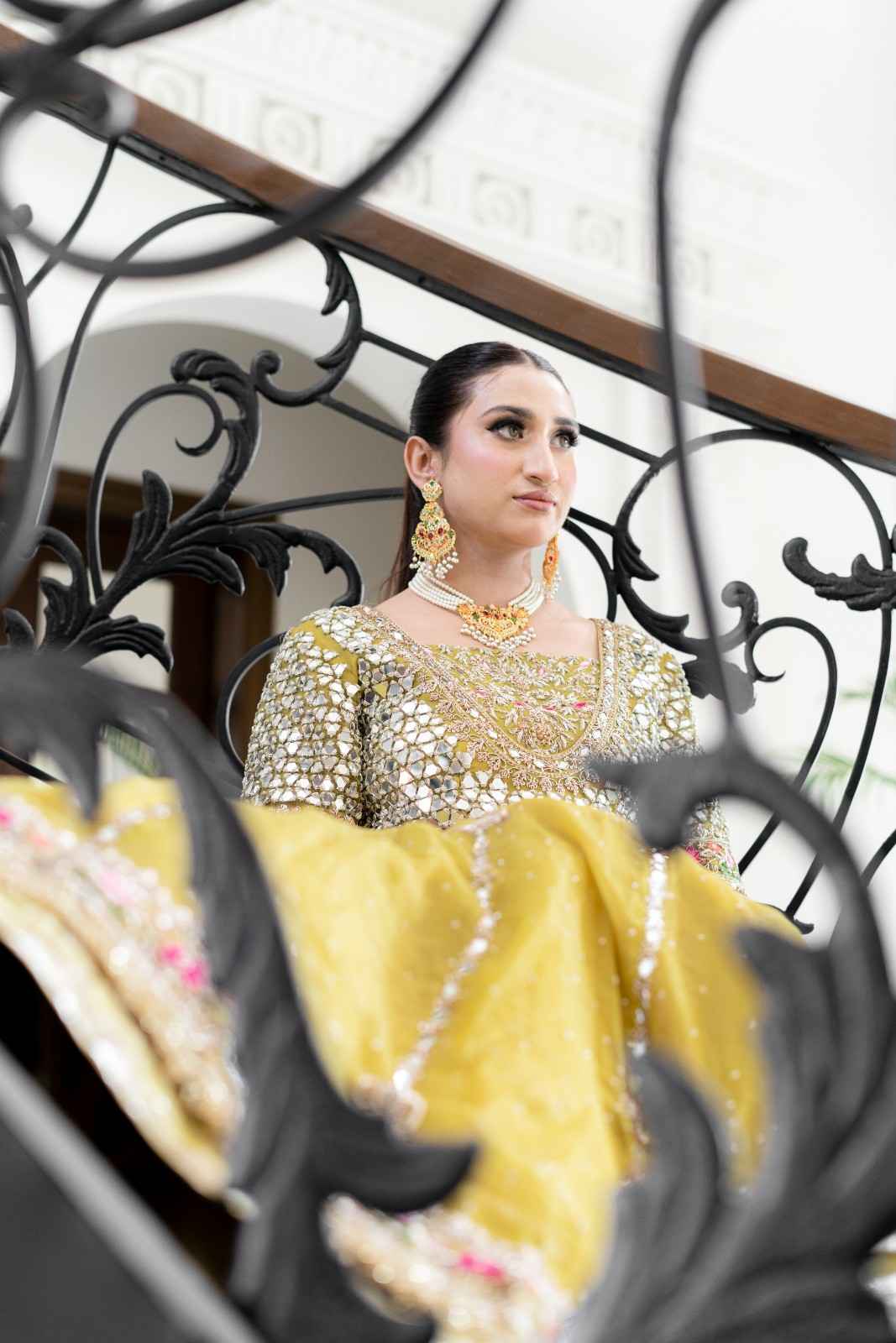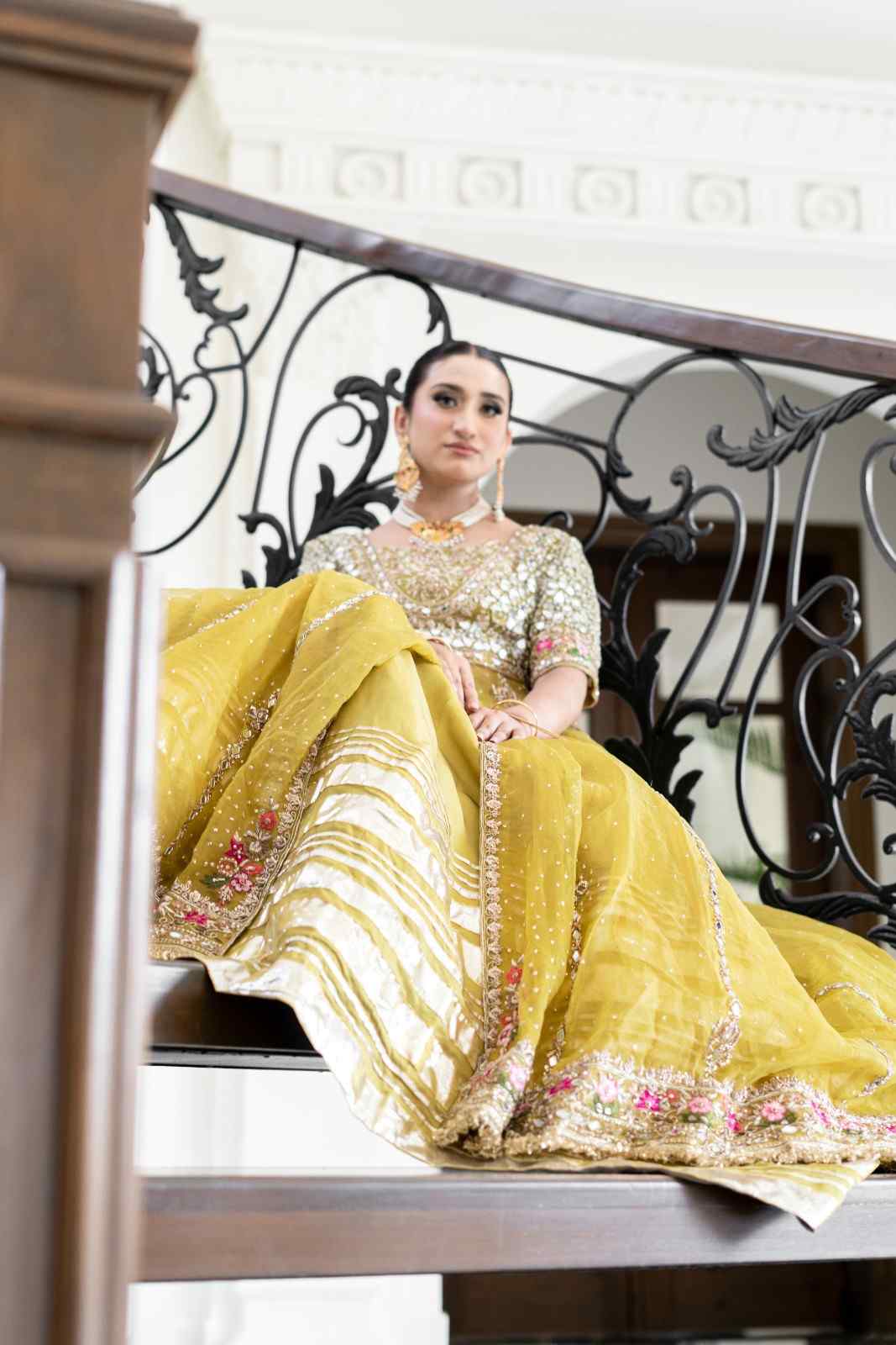 The traditional lemon yellow organza pishwas is a vision of elegance, perfect for mehndi or mayoun events. The heavy, formal design features Indian sleeves and is adorned with intricate handwork, including mirror, resham, salma, sequins, and dabka, along with gotta accents. The pishwas is finished with kiran. The matching lehnga showcases beautiful gotta work. Completing the ensemble, the dupatta is delicately sprayed with mukesh and enhanced with four-sided heavy borders, all finished with kiran.