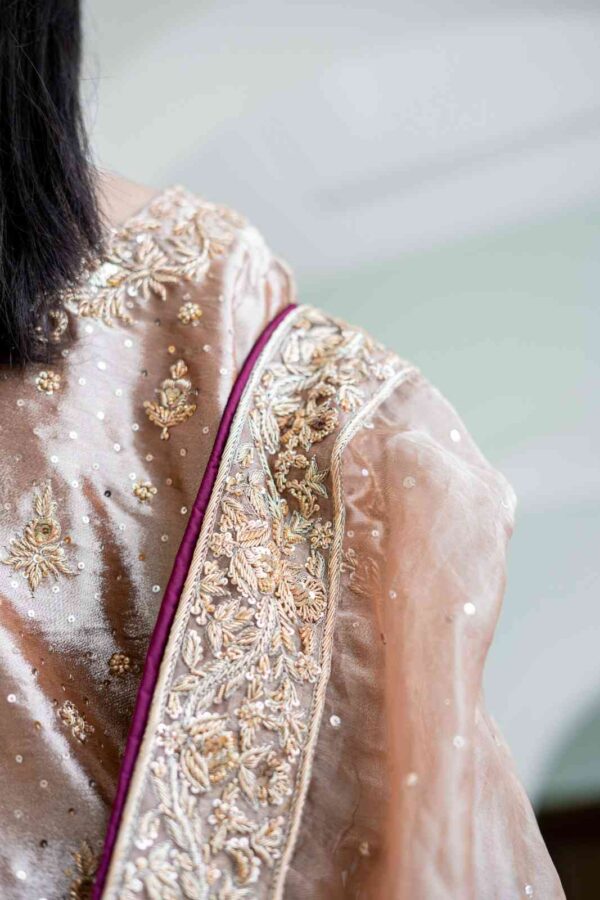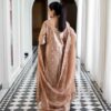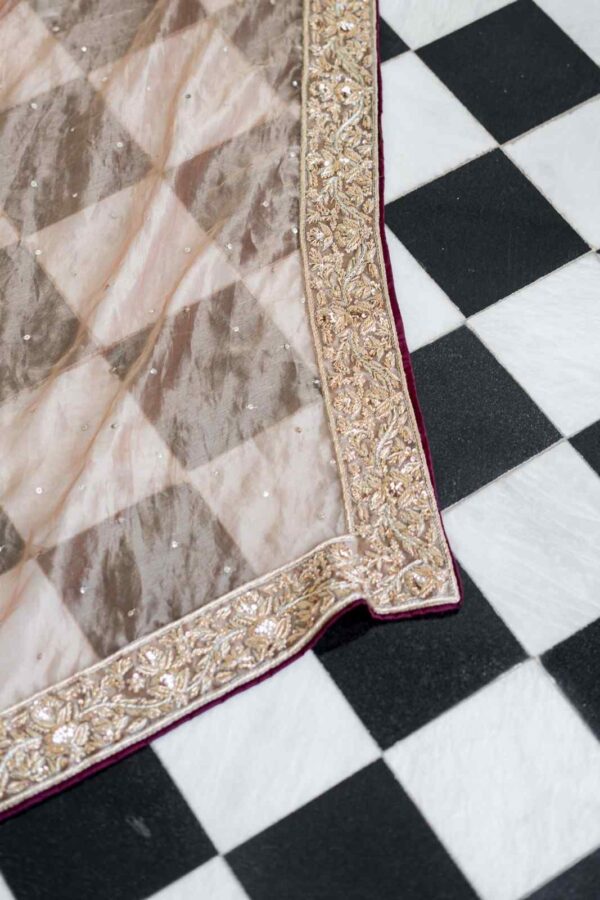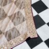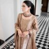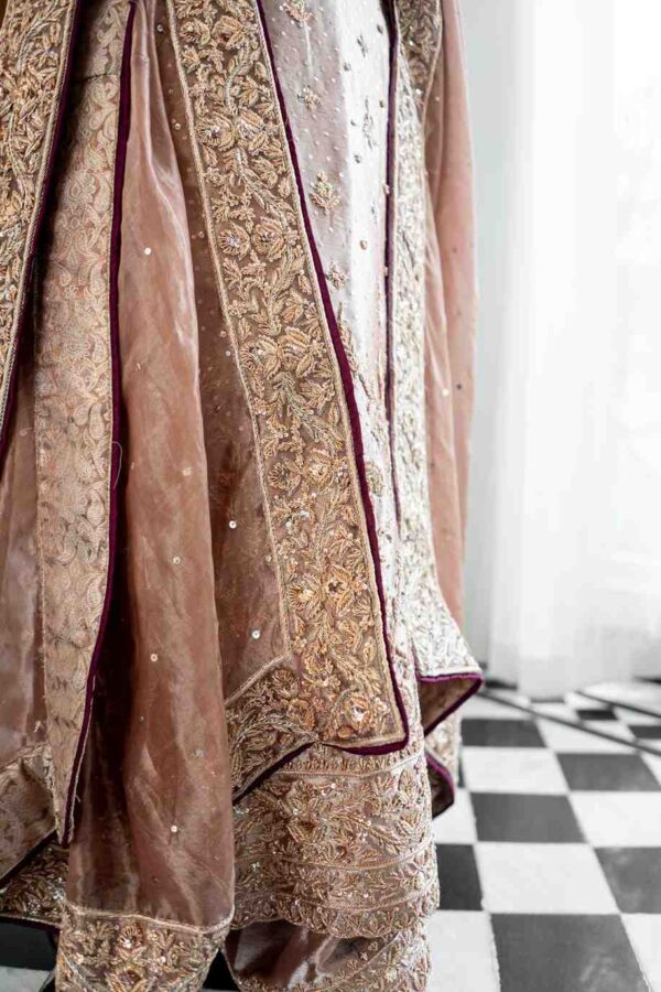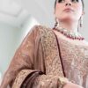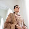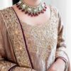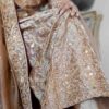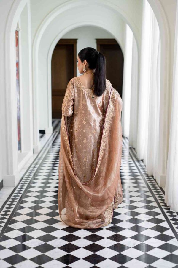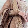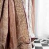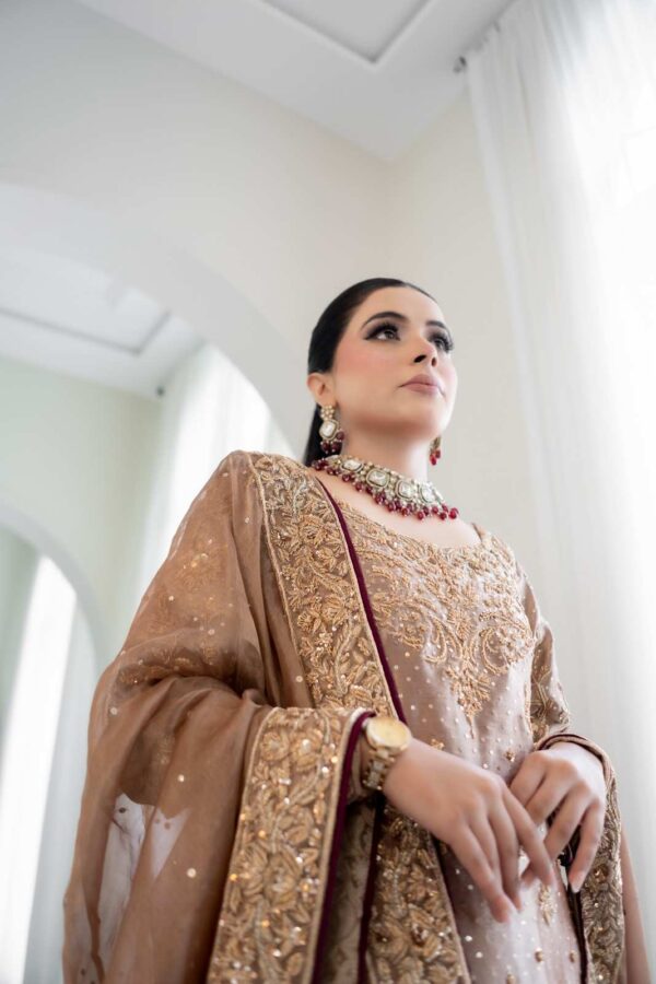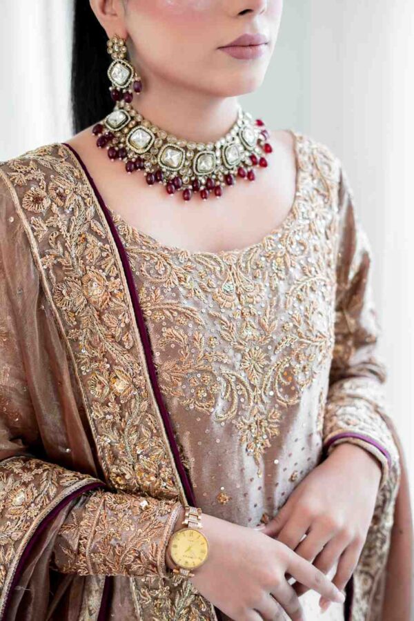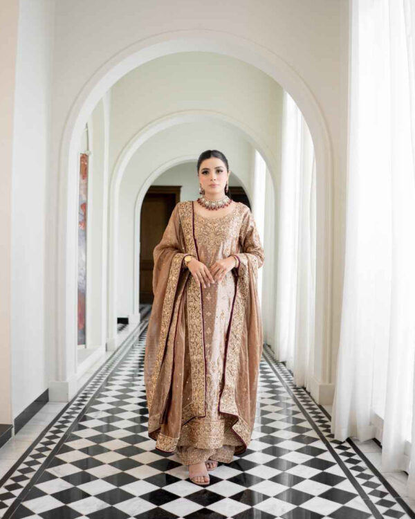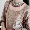 This heavy formal outfit is crafted from premium lama tissue fabric, offering a luxurious feel and appearance. The outfit is hand-embellished with intricate rose gold work on the neck, front, and back of the shirt, providing a touch of opulence. The sleeves are finished with a detailed border, enhancing the overall design. The shirt’s daman is sprayed with delicate booti, adding a subtle, yet elegant touch. The trousers feature heavy detailing on the bottoms, complementing the shirt’s design. The outfit is paired with a heavy shawl, showcasing a lavish four-sided border, making it ideal for special occasions.