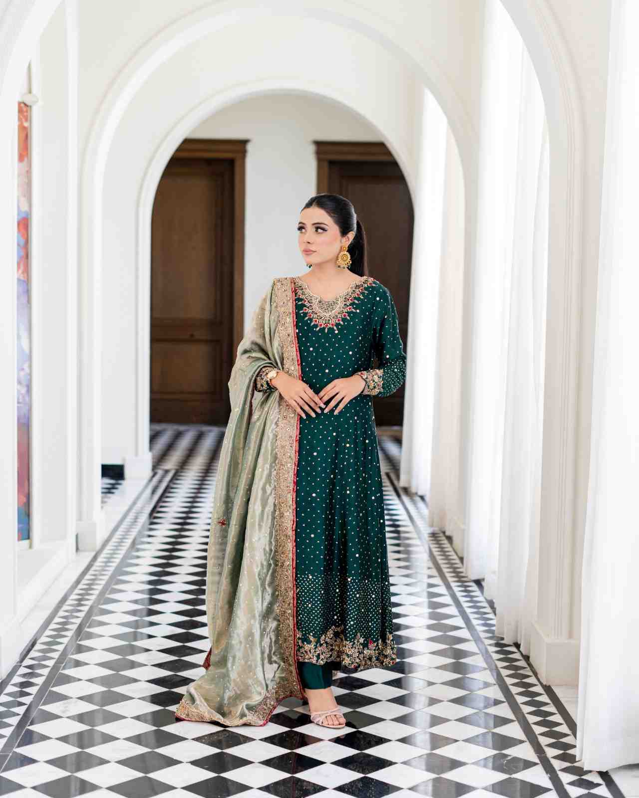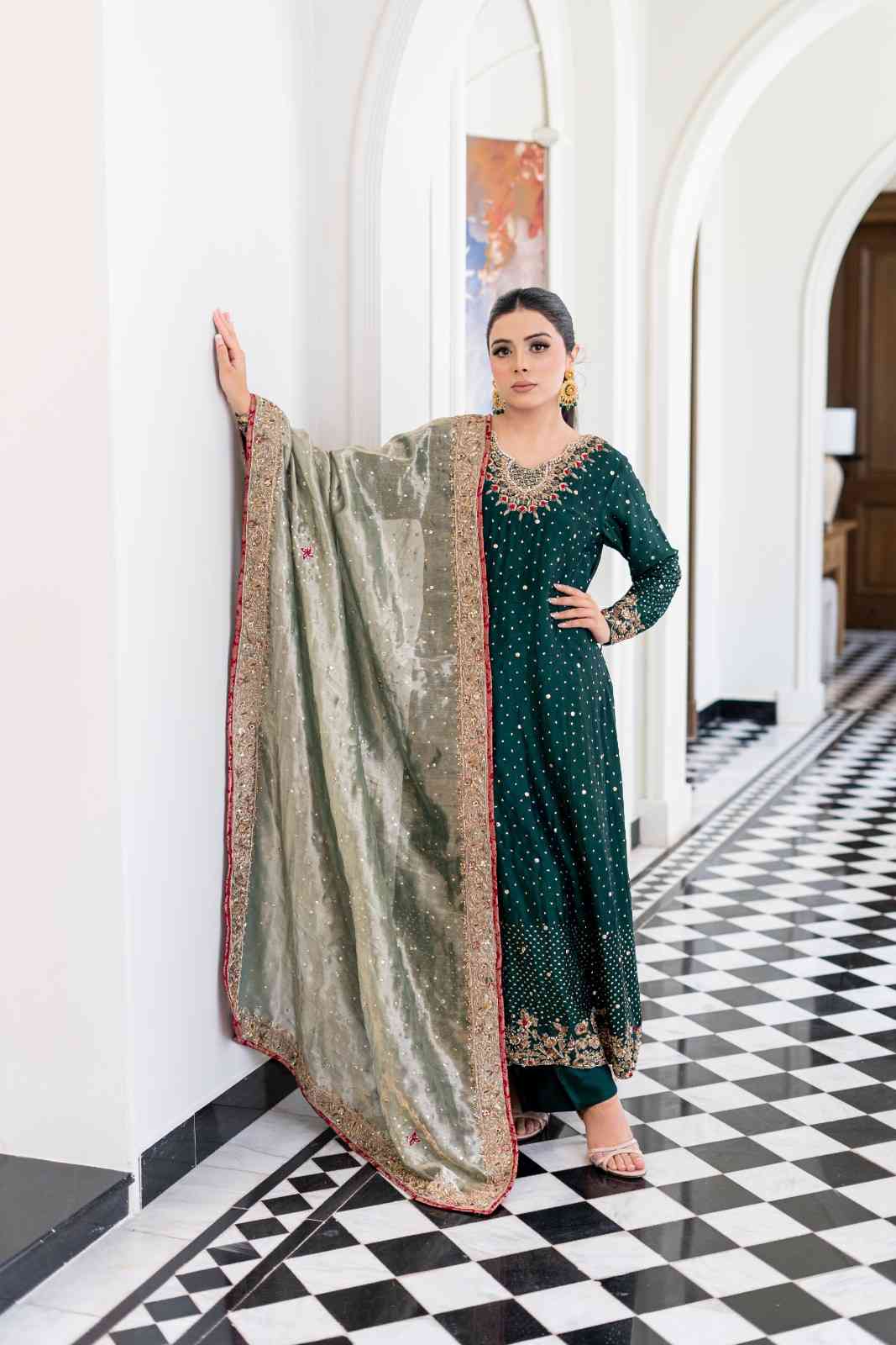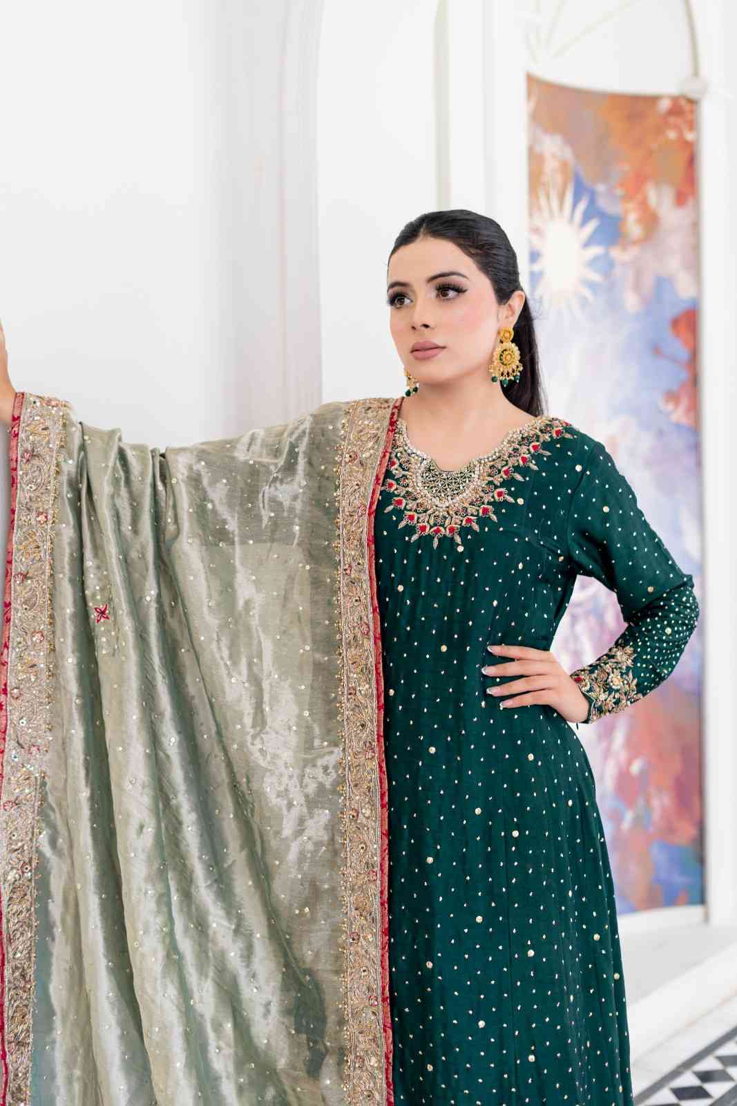 This bottle-green, heavy formal outfit is a vision of elegance. The fabric, likely silk, is adorned with intricate Mukesh work that sprays across both the front and back, creating a shimmering effect. The neckline and sleeves feature delicate handwork, adding a touch of sophistication. The heavy daman is finished with exquisite cutwork, making a statement. The outfit is complemented by an aqua-green tissue fabric dupatta, which is sprinkled with sequins, catching the light with every movement. A heavy border frames the dupatta on all four sides, completing this stunning ensemble.