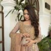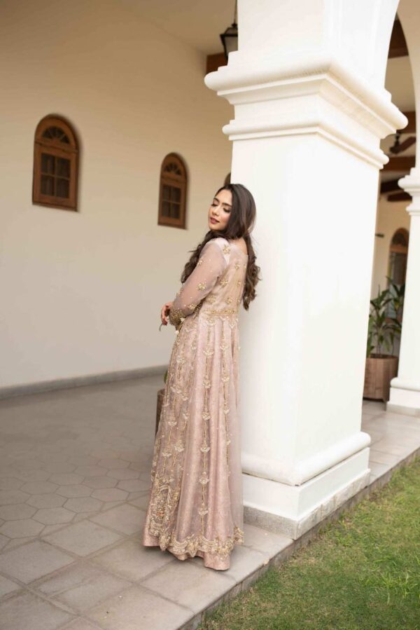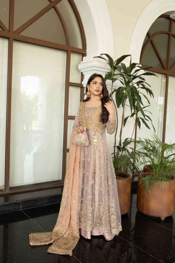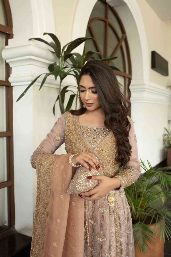 Organza embellished heavy side slit frock with antique gold kora dabka,crystal and pearl work. Complementing with heavy scallop border and intricate work on the sleeves. Paired with atlas inner frock and heavy border duppata. An elegant look for your festivities!
