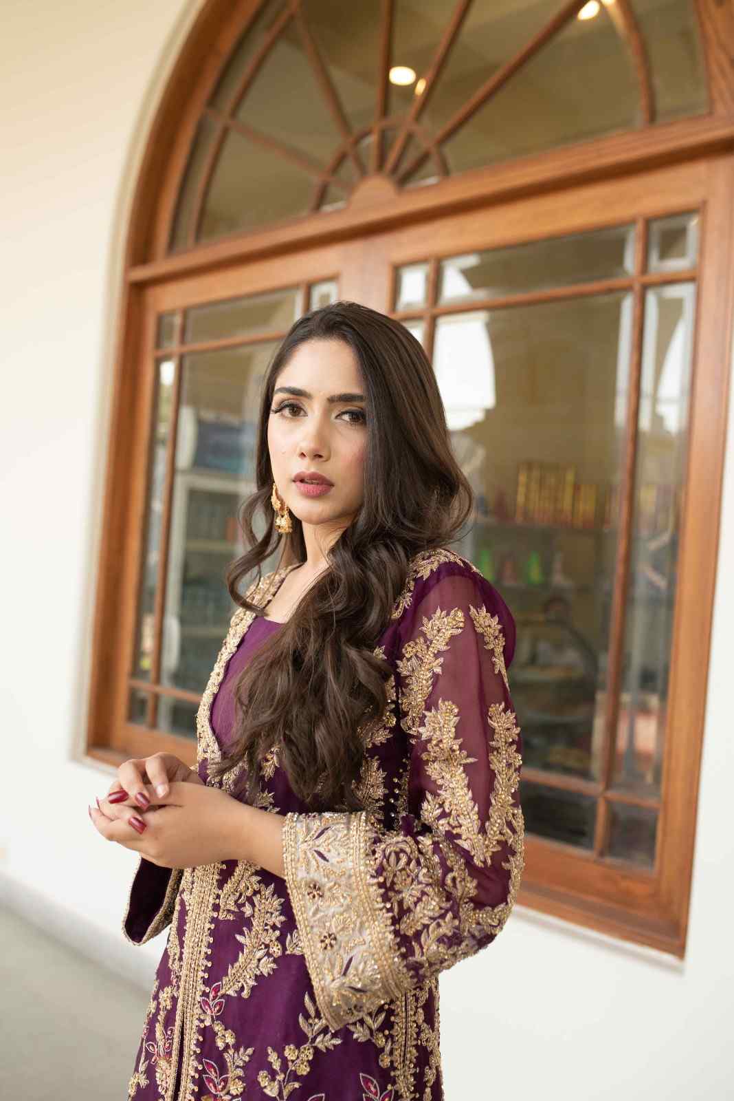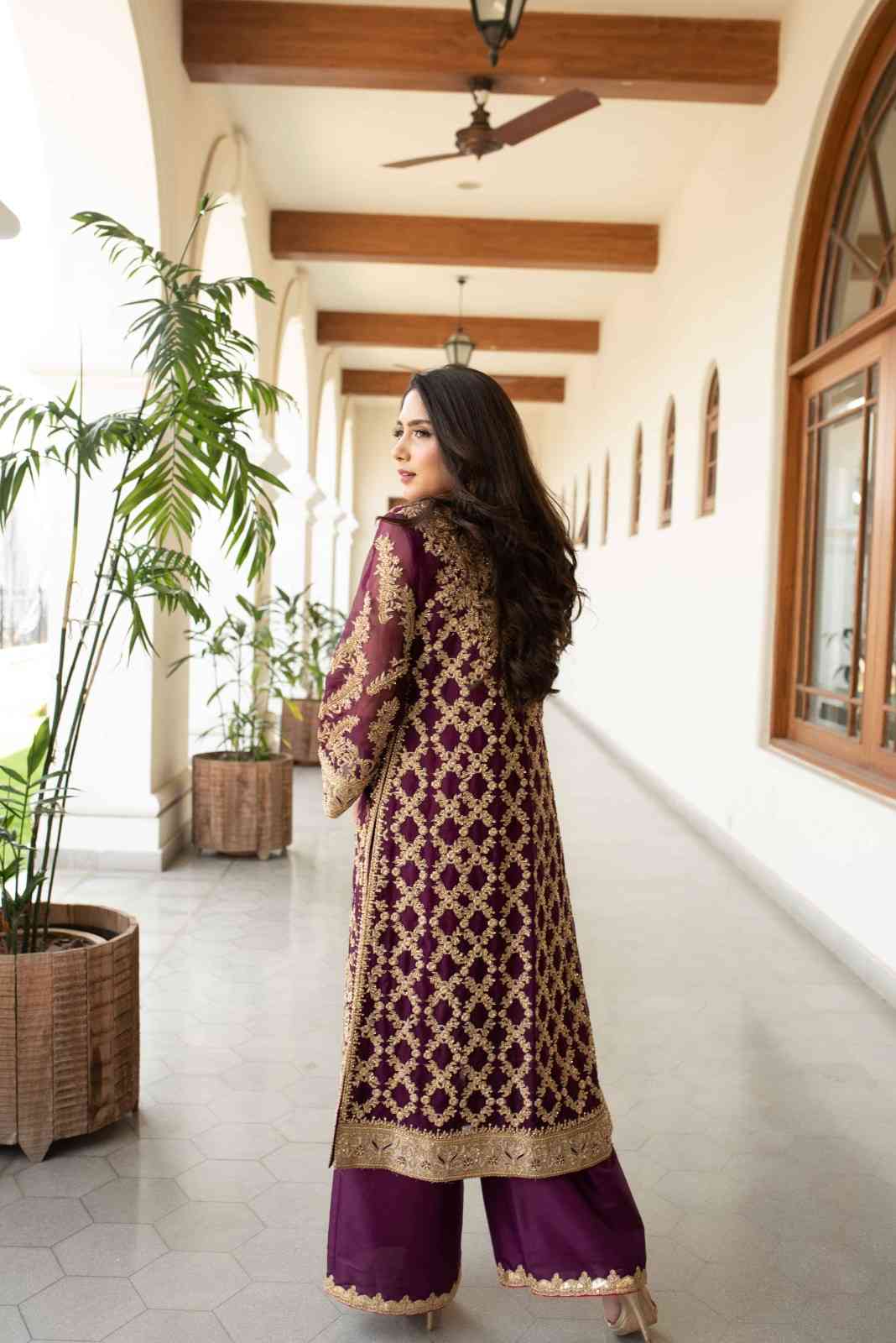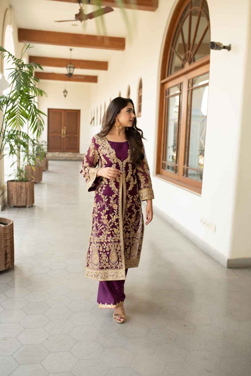 A perfect geometrical silhouette for everyone who loves sleek and stylish cuts, precisely hand-crafted slit open jacket on organza fabric with bold patterns. Complementing crystal, kora dabka and tilla work. Paired with silk under-suit. A classic and bold look!
