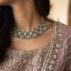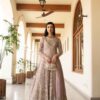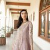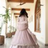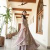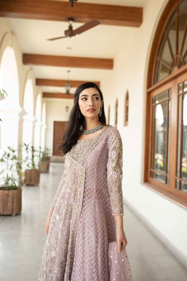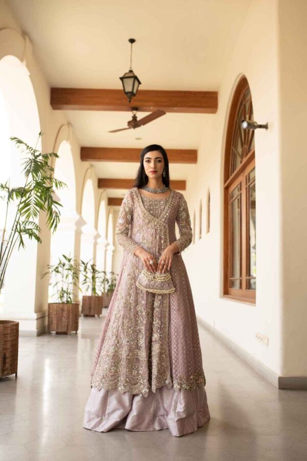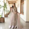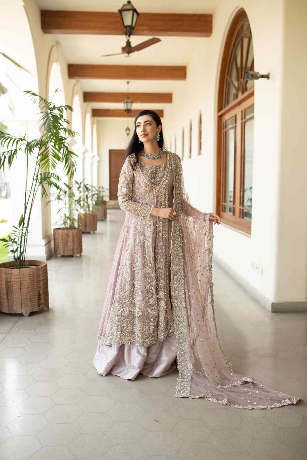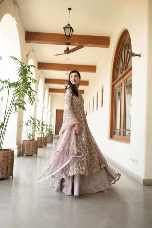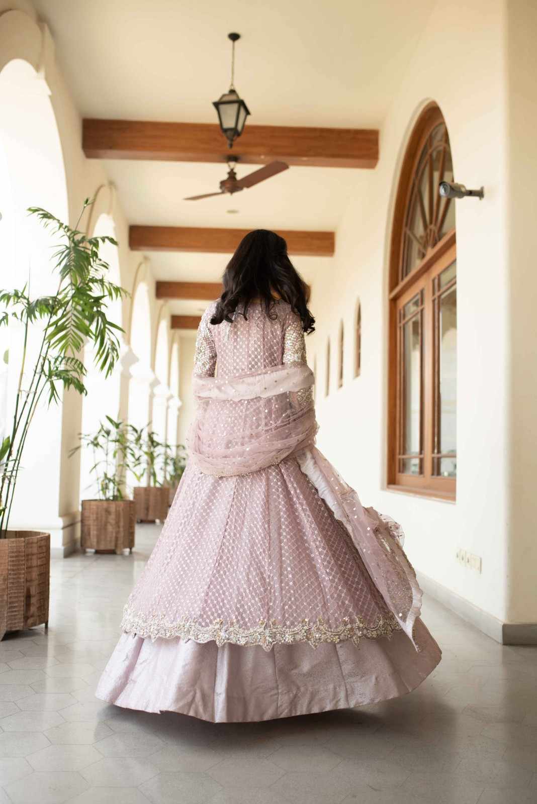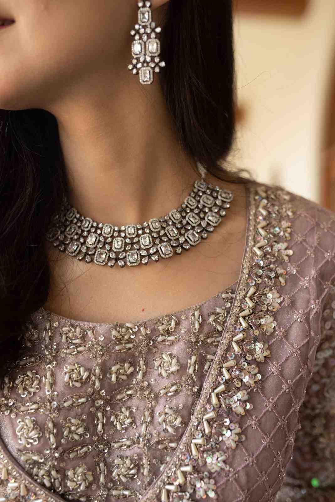 A lilac affair! Organza flared embellished angrakha with Crystal, swarovski, pearl and sequins work. With heavy scalloped border, heavy crystal under shirt. With atlas lehenga paired with mukesh duppata with scalloped heavy border. A crystal affair you don’t want to miss out!