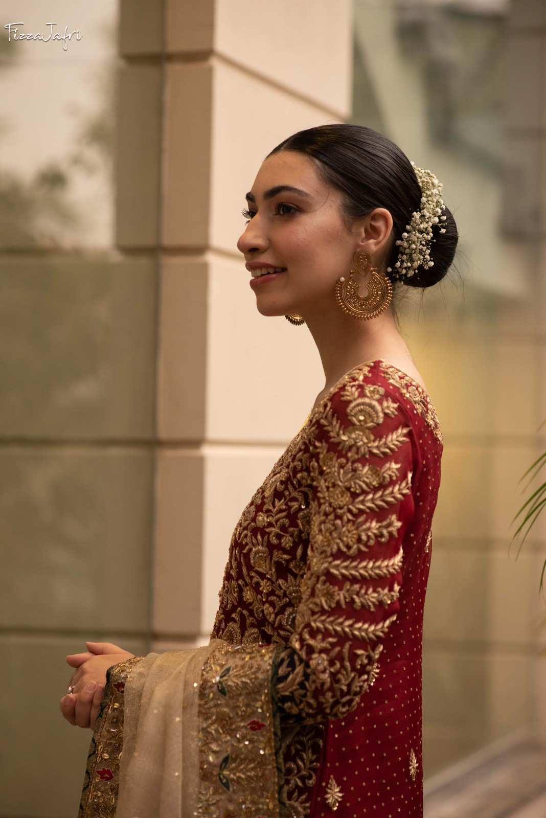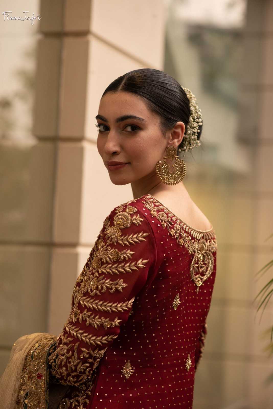 Carefully hand-crafted pure kataan organza embellished long shirt with crystal, tilla and dabka kora embellishment with heavy border Paired with pure silk embellished banarasi azaar pants and heavy border gold zari net. An elegant attire with precise details!