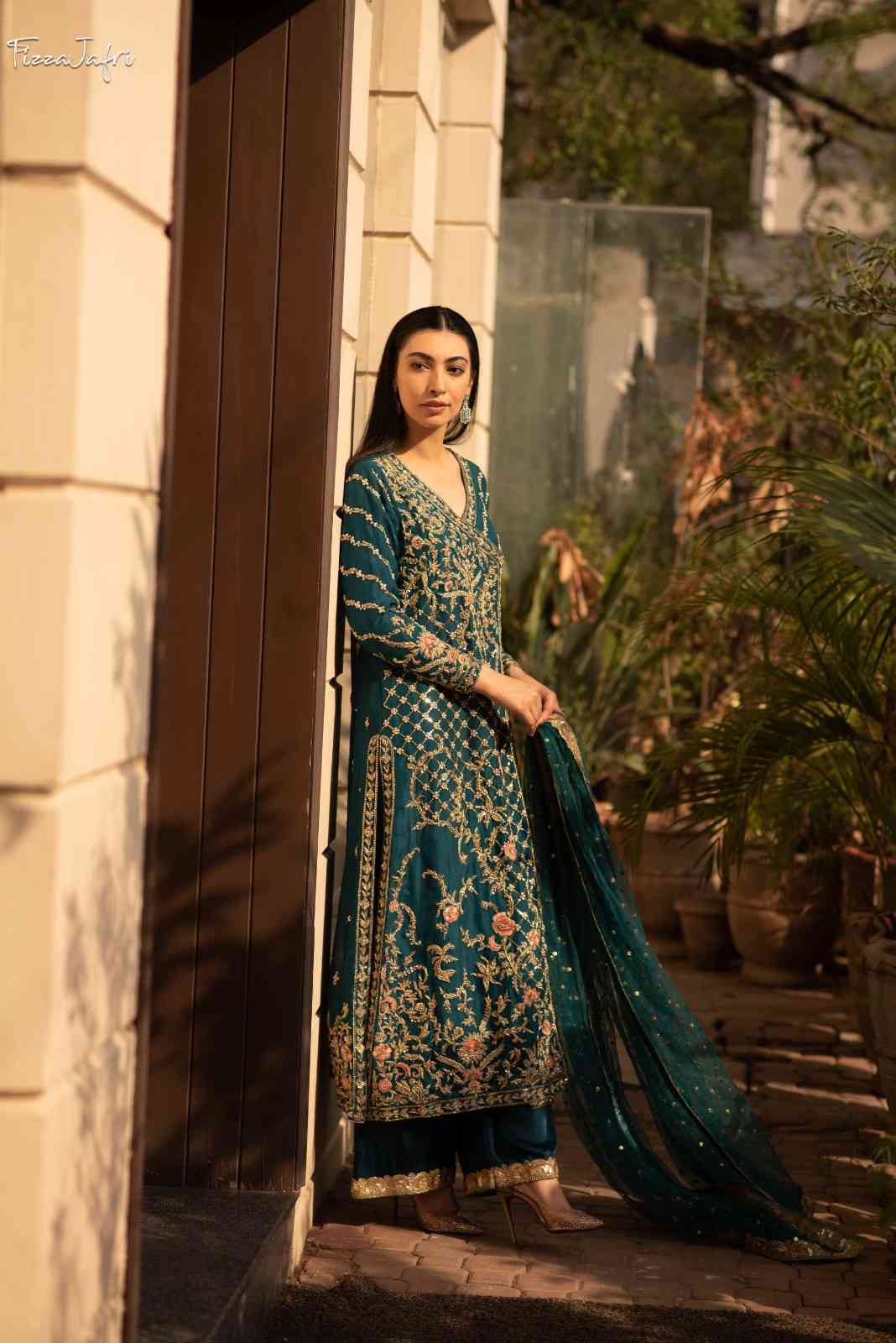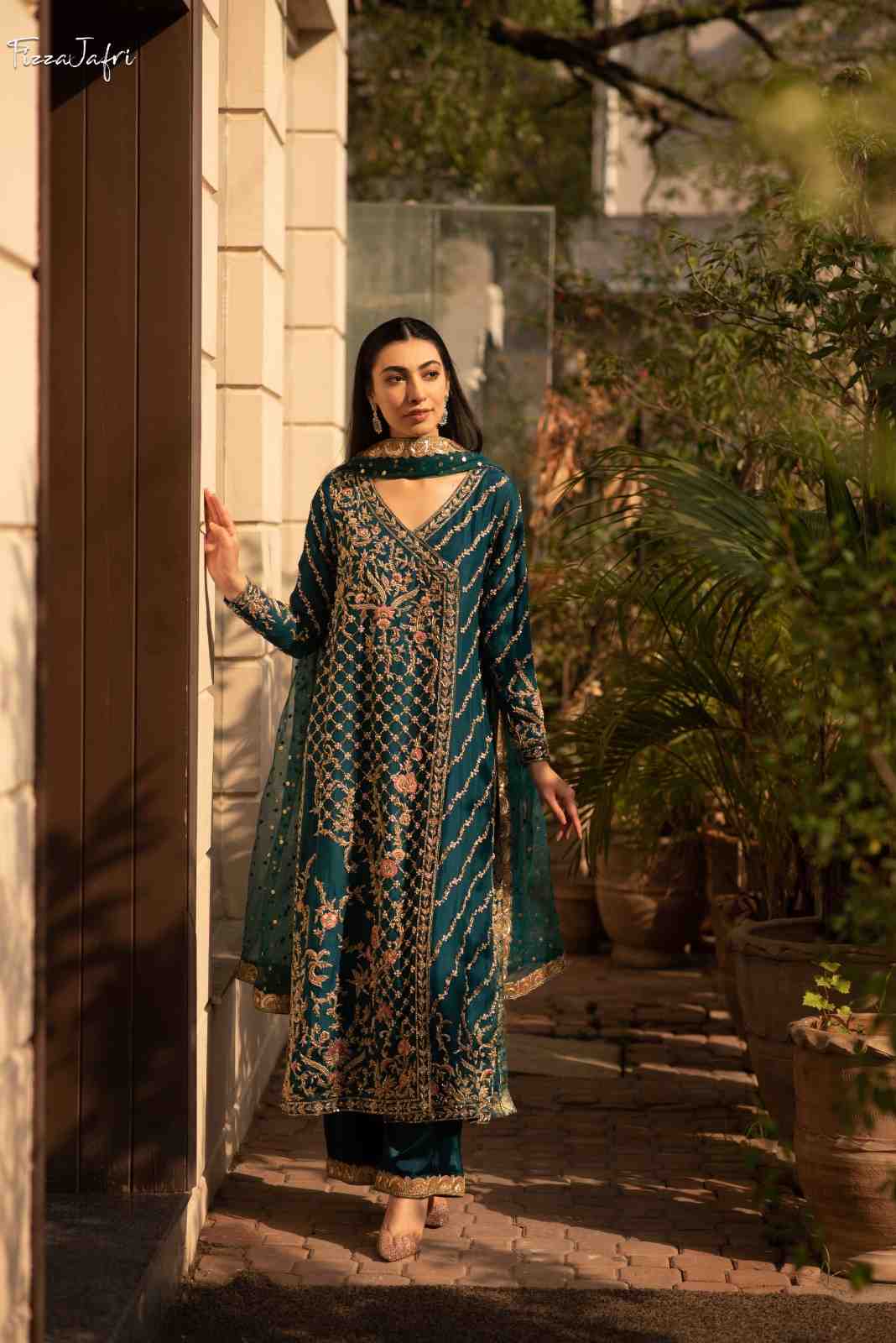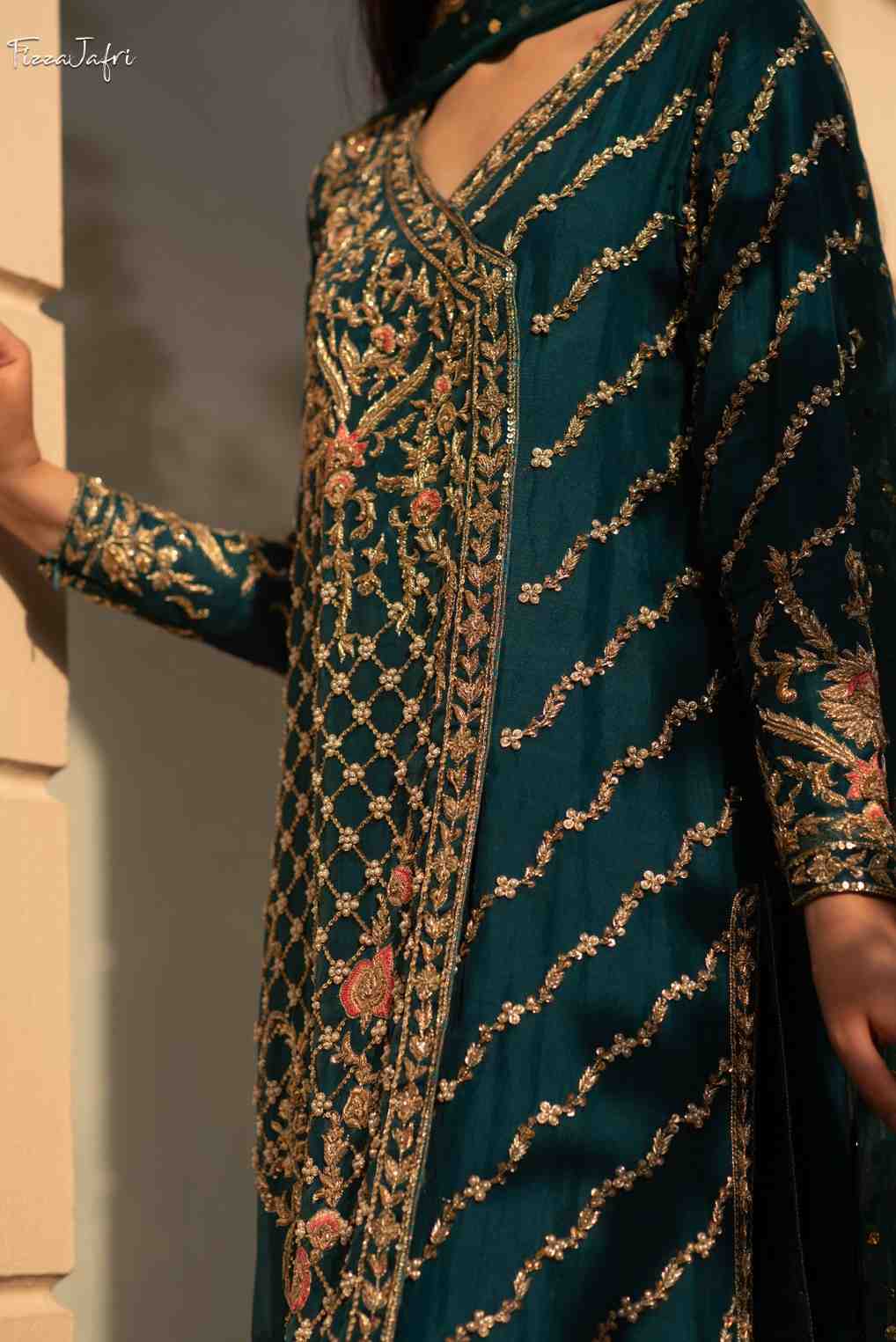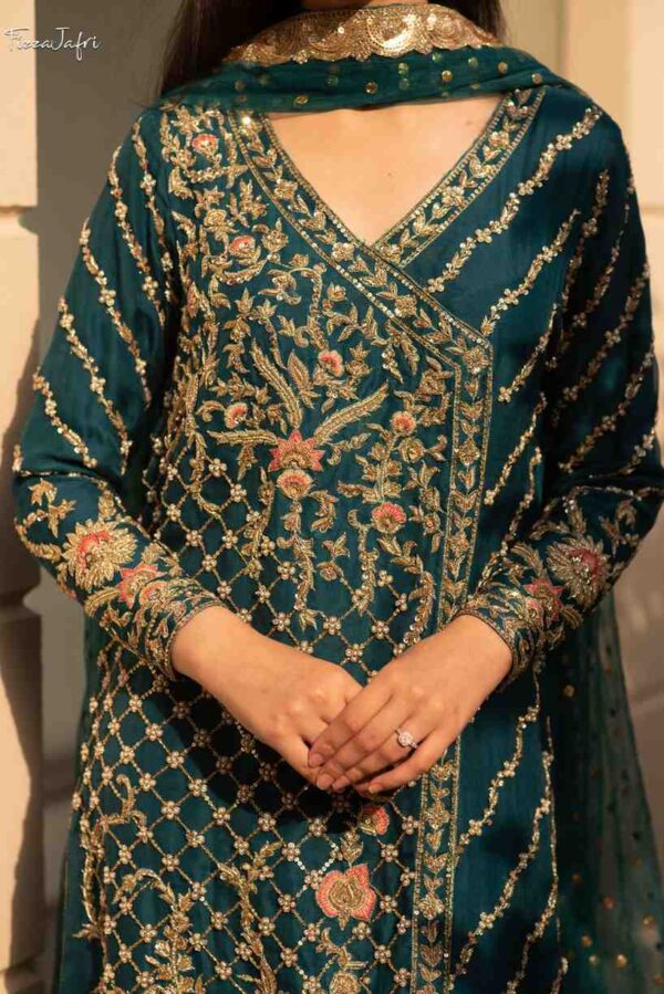 Exquisitely embellished pure katan Organza with side slit angrakha with dabka, kora and resham work in dull gold. Sleek diagonal lines embellished with intricate work! Paired with Azaar pants and net mukesh duppata. An elegant look!