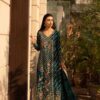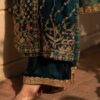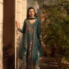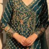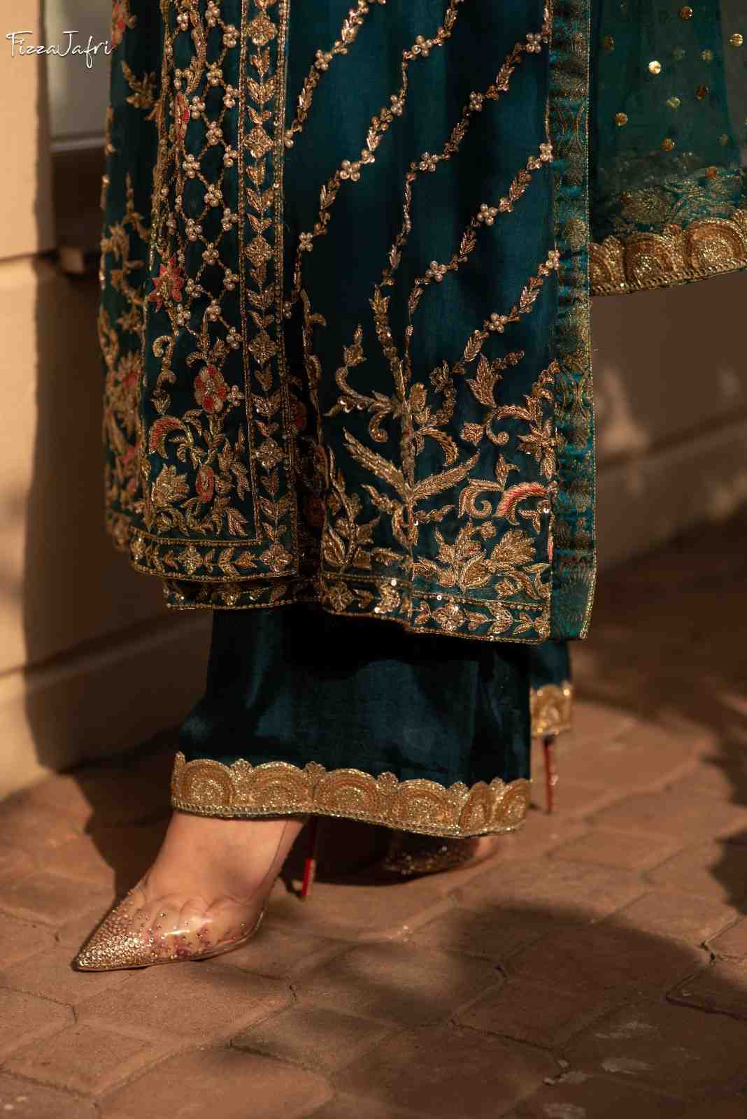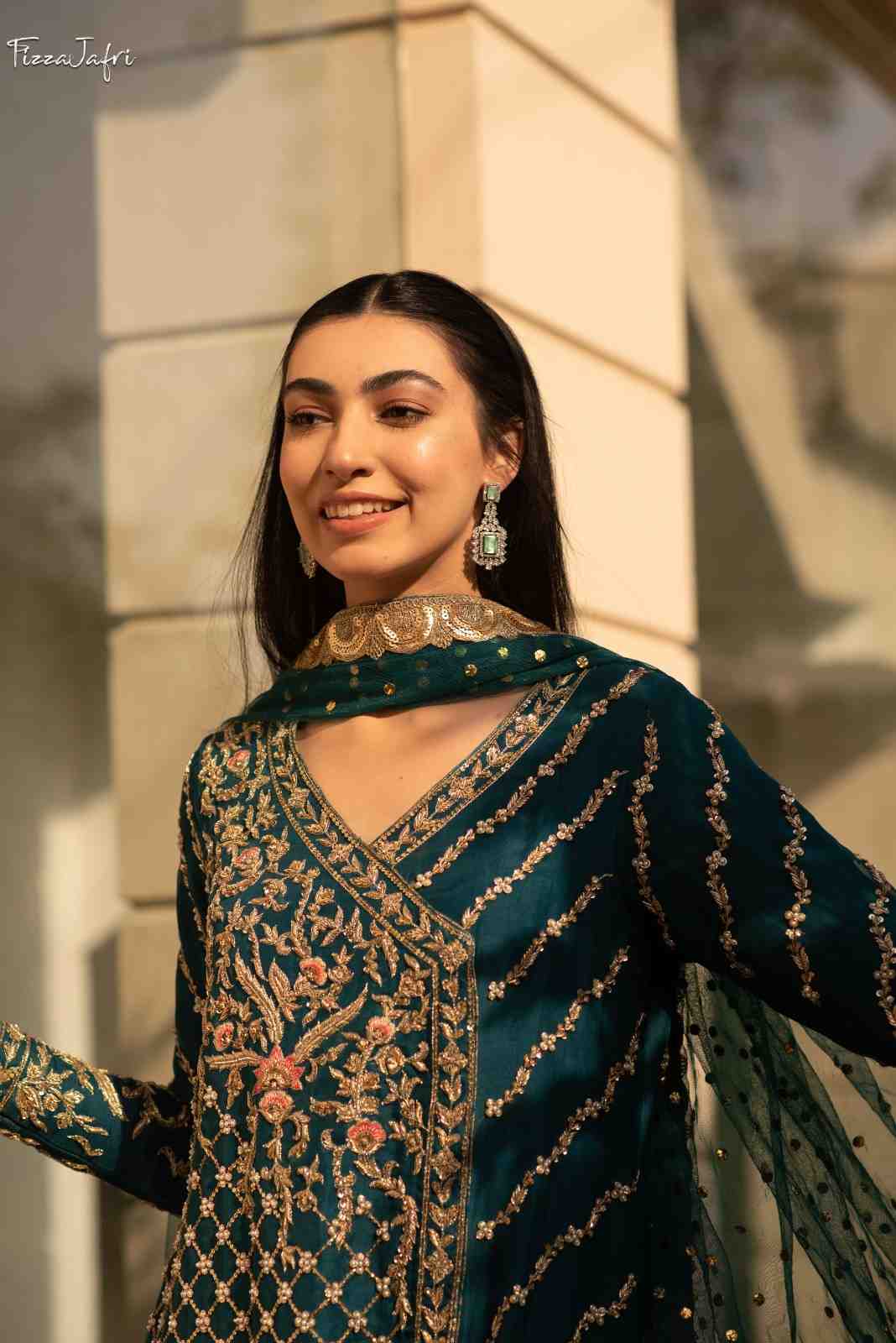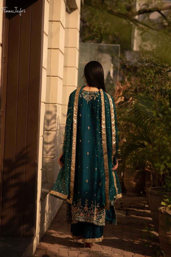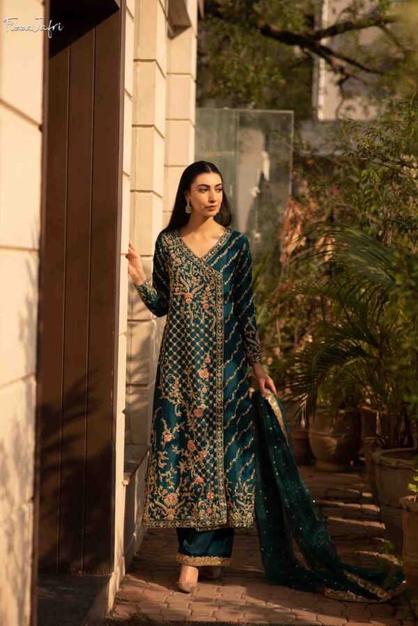 Exquisitely embellished pure katan Organza with side slit angrakha with dabka, kora and resham work in dull gold. Sleek diagonal lines embellished with intricate work! Paired with Azaar pants and net mukesh duppata. An elegant look!