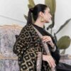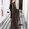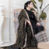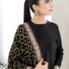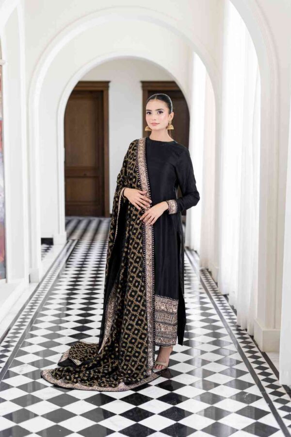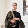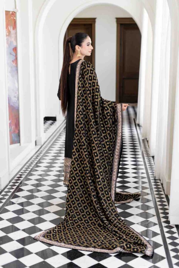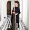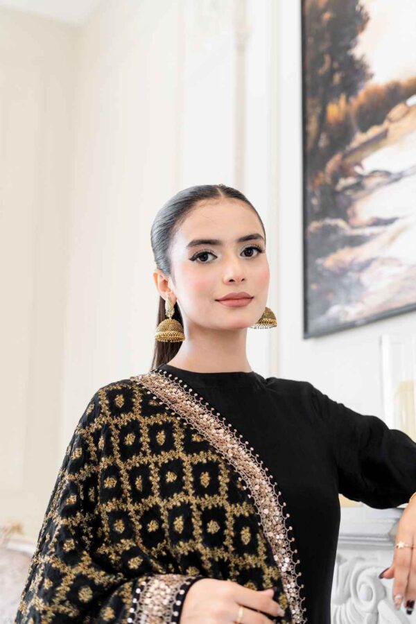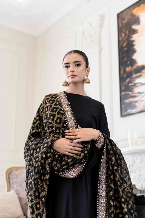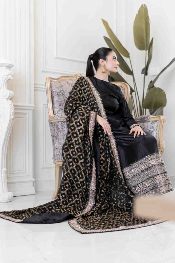 This elegant ensemble features a straight black shirt with a dull gold heavy border on the front and back. The outfit is complemented by a black shawl with matching heavy borders on all four sides. A pair of choori daar completes the look, offering a polished and sophisticated style, perfect for formal occasions.