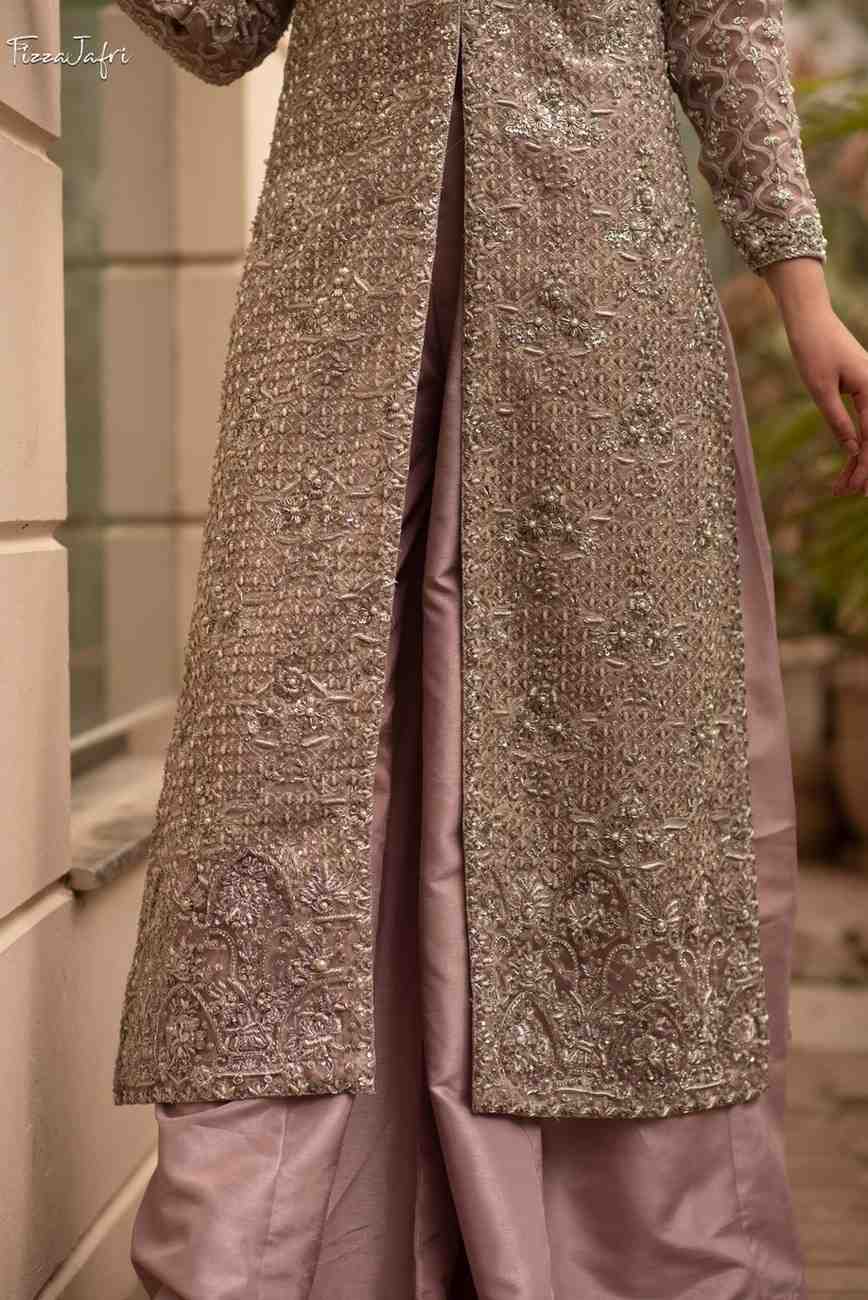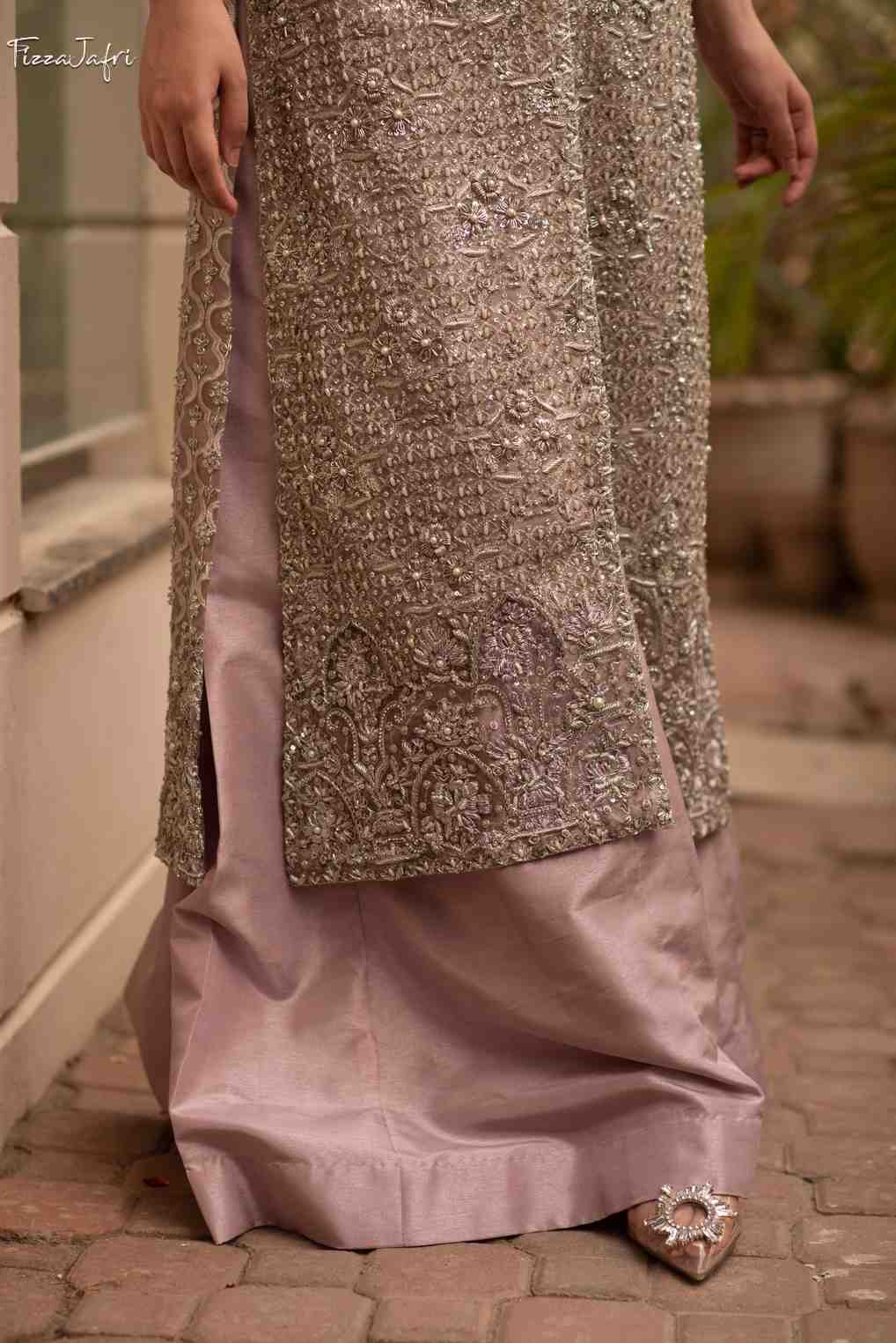 A lilac affair! Organza flared embellished angrakha with Crystal, swarovski, pearl and sequins work. With heavy scalloped border, heavy crystal under shirt. With atlas lehenga paired with mukesh duppata with scalloped heavy border. A crystal affair you don’t want to miss out!