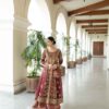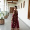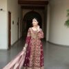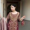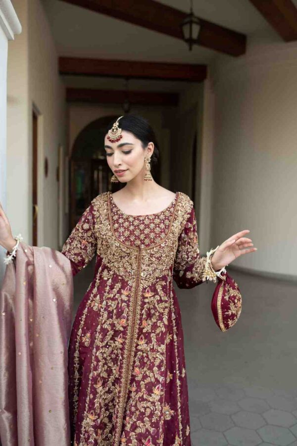 Beautifully hand-crafted organza gown with front and back embellished, heavy border with different patterns and designs. Fully embellished body with embellished sleeves, kora dabka work with resham and tilla in antique gold colour. Along with heavy bordered atlas lehenga and tissue duppata with sitara chan! A perfect combination for your special day.