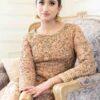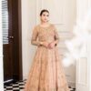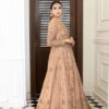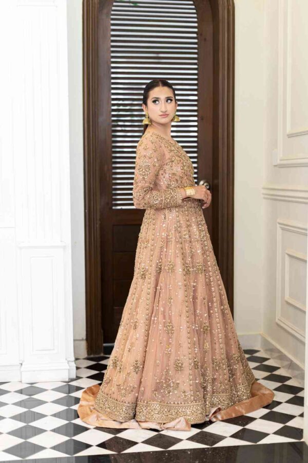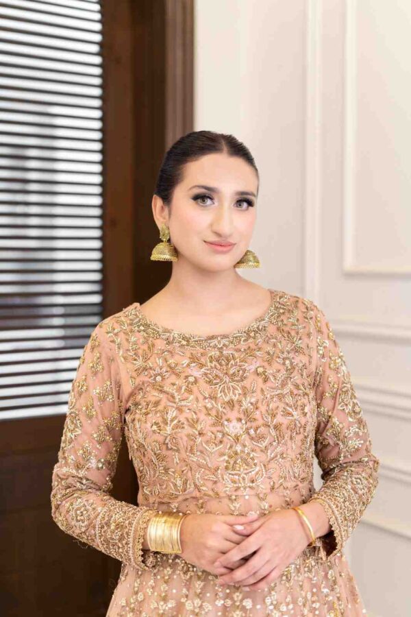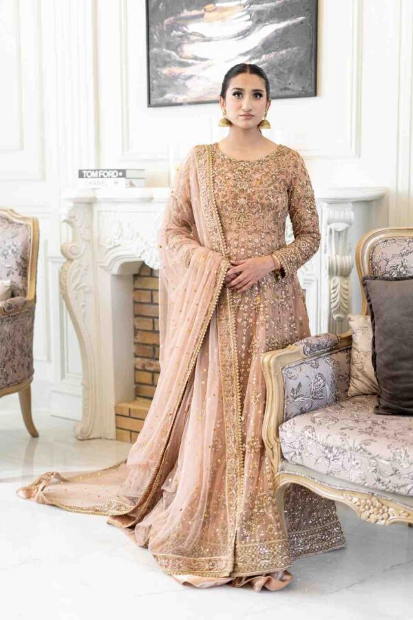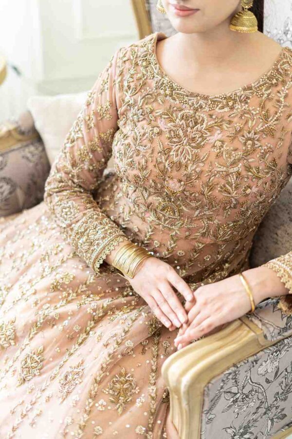 This heavy peachy pishwas is crafted from delicate net fabric, fully embellished with intricate handwork. The front and back of the pishwas shimmer with beads, sequins, salma, and dabka, all in a harmonious blend of light and antique gold tones. It’s paired with a plain lehnga, offering a beautiful contrast. The ensemble is completed with a net dupatta, featuring a lavish 4-sided heavy border and a delicate mukesh spray throughout.