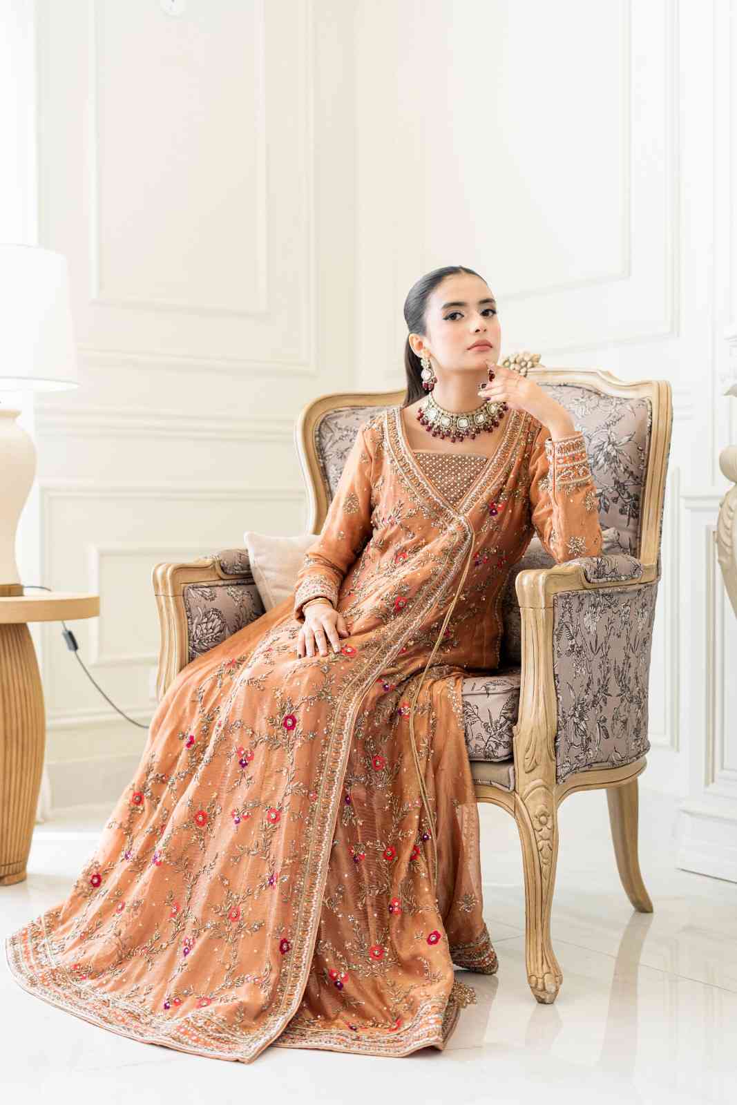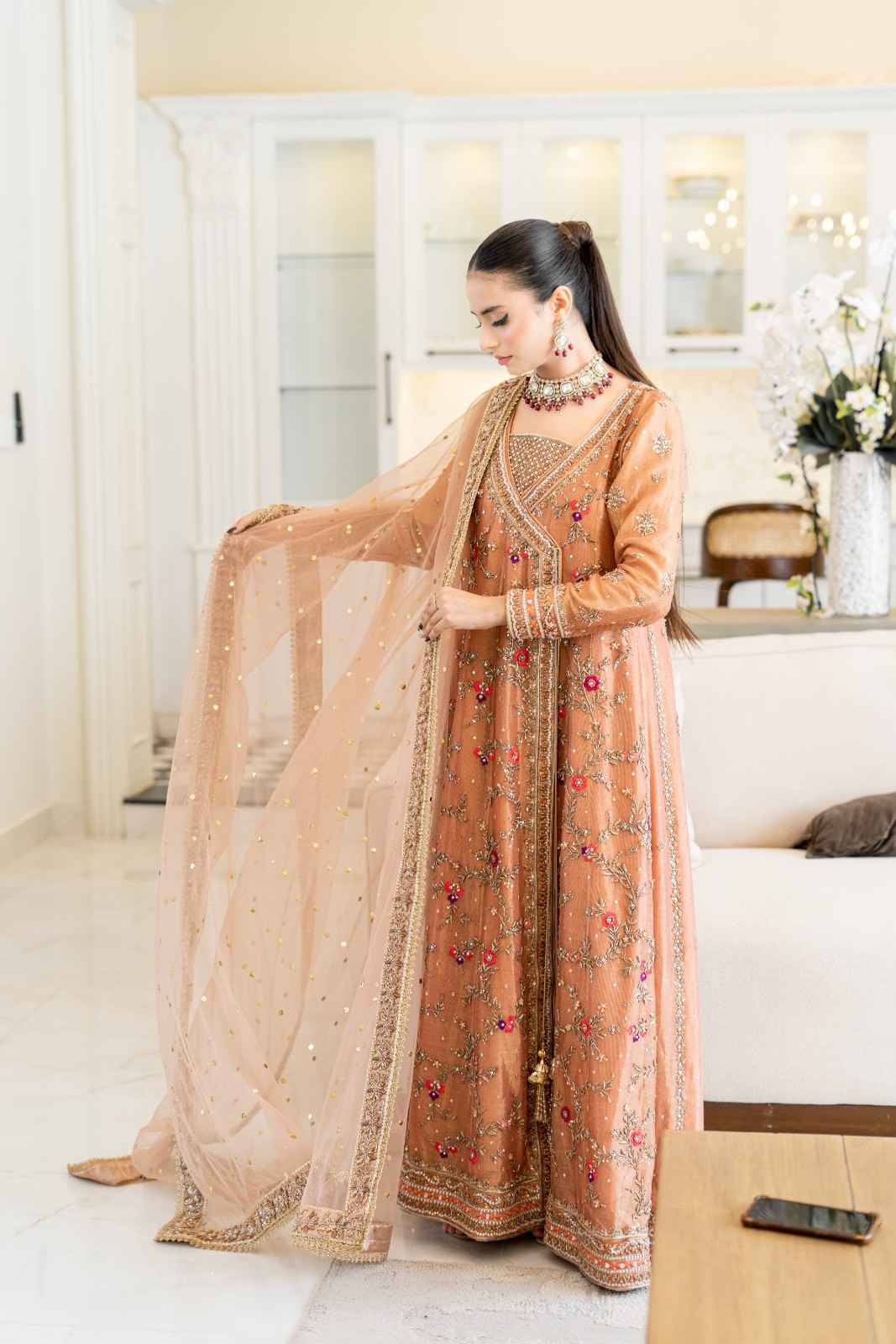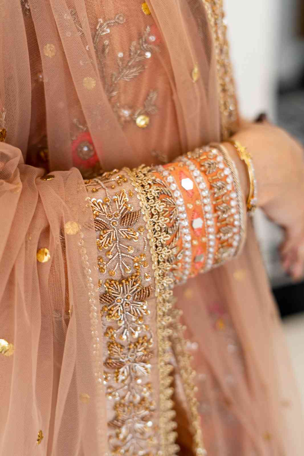 Step into elegance with our exquisite pastel orange Angrakha. This heavy, formal ensemble is crafted from pure cotton zari net fabric. The neckline, sleeves, and daman are adorned with detailed kora, dabka, resham,gota, crystals and mirror work. The look is completed with a handmade dupatta, embellished with heavy borders on all four sides, making it a perfect blend of traditional artistry and modern design.