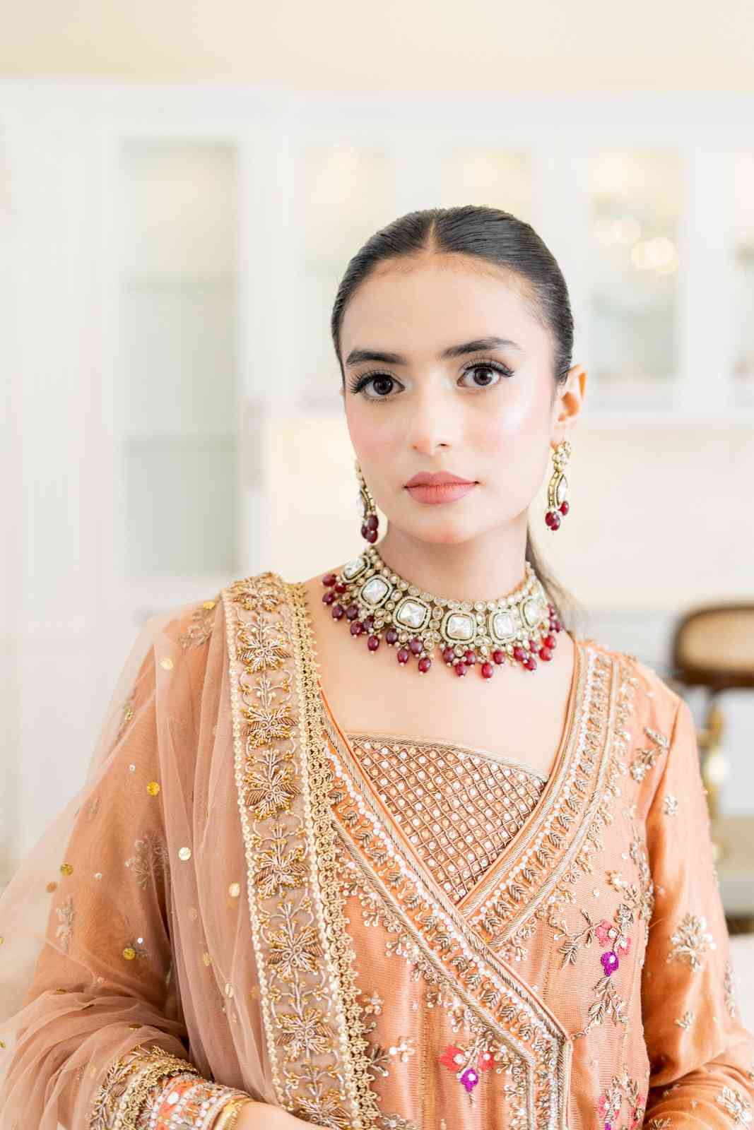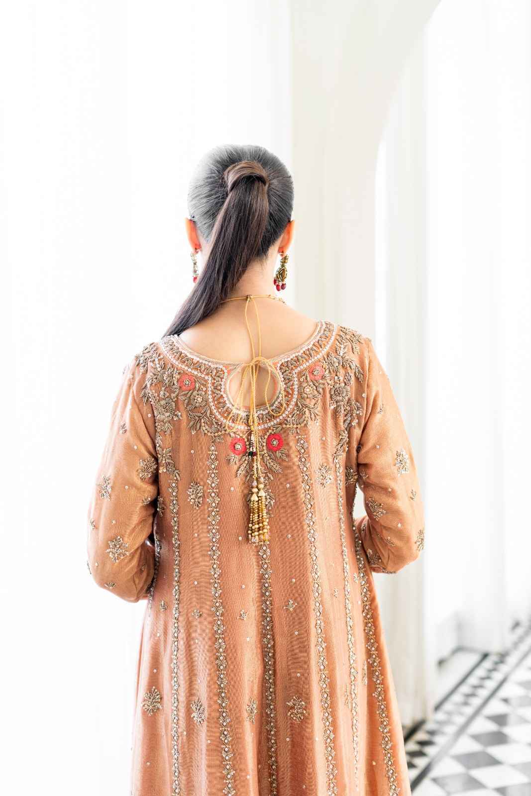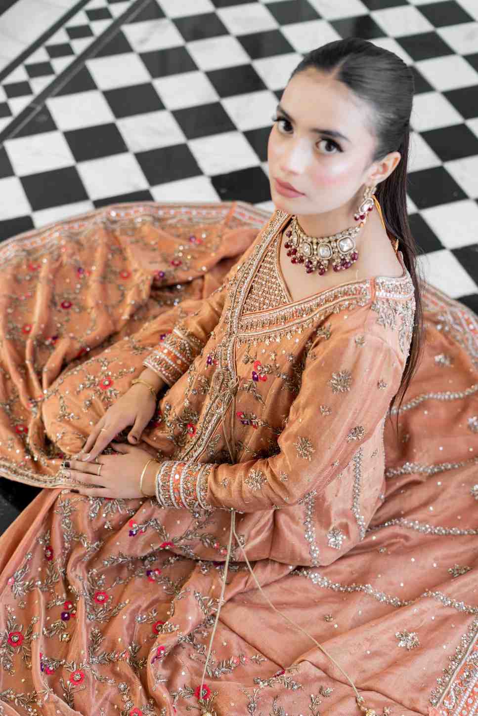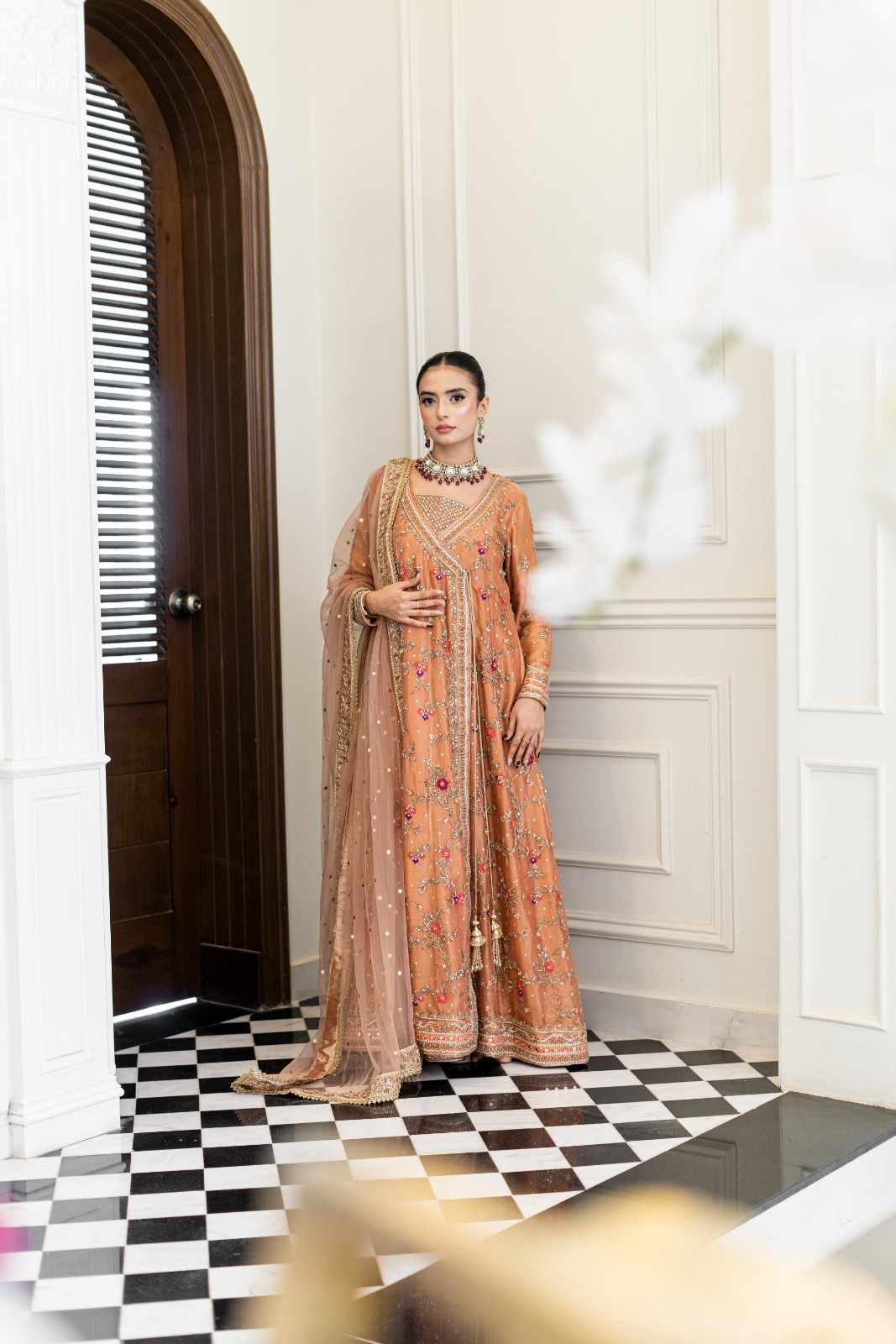 Step into elegance with our exquisite pastel orange Angrakha. This heavy, formal ensemble is crafted from pure cotton zari net fabric. The neckline, sleeves, and daman are adorned with detailed kora, dabka, resham,gota, crystals and mirror work. The look is completed with a handmade dupatta, embellished with heavy borders on all four sides, making it a perfect blend of traditional artistry and modern design.