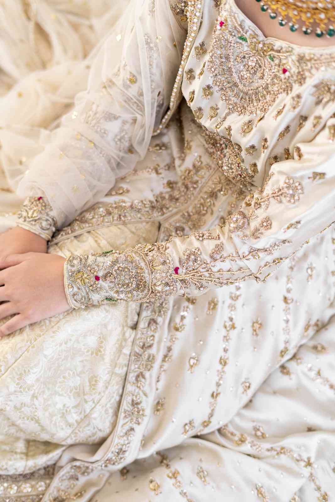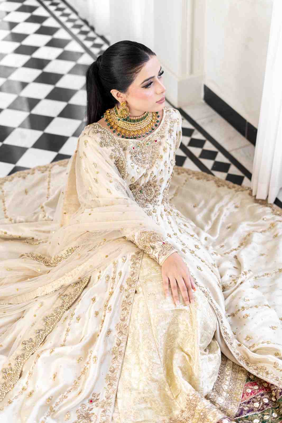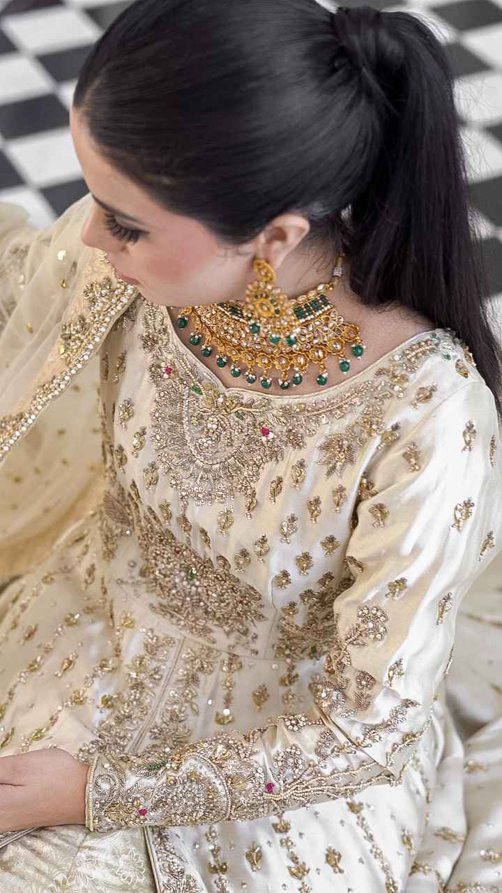 Our cream white bridal pishwas is a vision of beauty and traditional craftsmanship. The pishwas is adorned with intricate handwork, featuring light gold salma, dabka, crystals, gotta, rods and pearls, along with two-tone resham embroidery in red and green. The sleeves, front, and back of the pishwas are meticulously embellished, creating a rich and opulent look. The ensemble is paired with a cream white kimkhuwaab lehenga, complemented by a chatta patti border in shades of purple, green, and pink, enhanced with mukesh detailing. A heavy net dupatta completes the look, featuring four-sided borders with matching handwork and a delicate mukesh spray throughout.